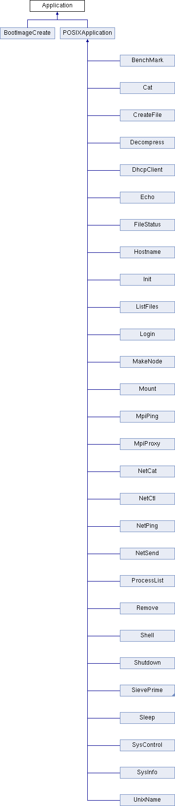 Implemented in DhcpClient, MpiProxy, BootImageCreate, NetSend, MpiPing, MpiPrime, Cat, NetCat, NetCtl, Shell, SysInfo, SysControl, BenchMark, Decompress, Echo, Hostname, Init, Login, ListFiles, MakeNode, Mount, SievePrime, Remove, Shutdown, Sleep, FileStatus, CreateFile, UnixName, NetPing, and ProcessList.